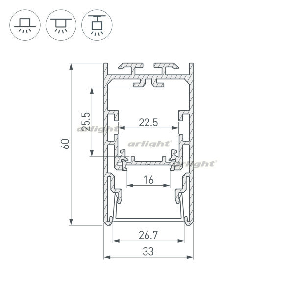 Отсек для блока питания (21х24 мм) и съемная площадка для светодиодной ленты с фиксаторами значительно облегчают сервисное обслуживание осветительного оборудования. Габаритные размеры профиля составляют 2500 мм в длину, 33 мм в ширину и 60 мм в высоту. Площадка для установки светодиодных лент позволяет использовать ленту шириной до 15 мм и мощностью до 48 Вт/м. Это обеспечивает гибкость в выборе светодиодных лент и создает потрясающие световые решения.