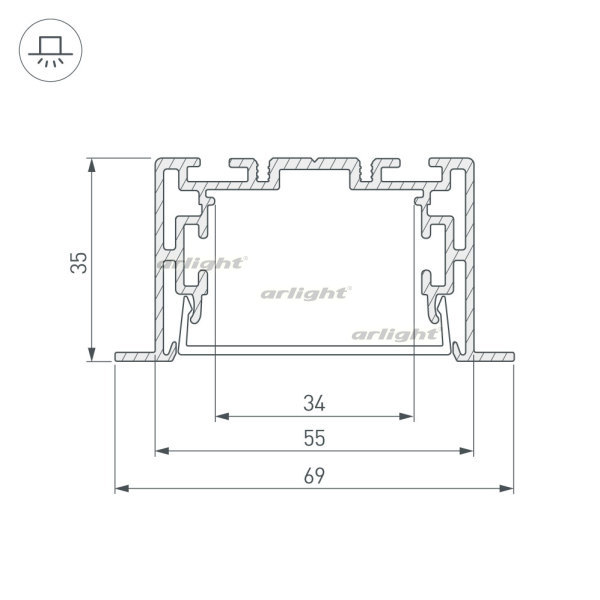 Габаритные размеры профиля составляют 2500 мм в длину, 69 мм в ширину и 35 мм в высоту. Площадка для установки светодиодных лент позволяет использовать ленту шириной до 34 мм и мощностью до 51 Вт/м. Это обеспечивает гибкость в выборе светодиодных лент и создает потрясающие световые решения.