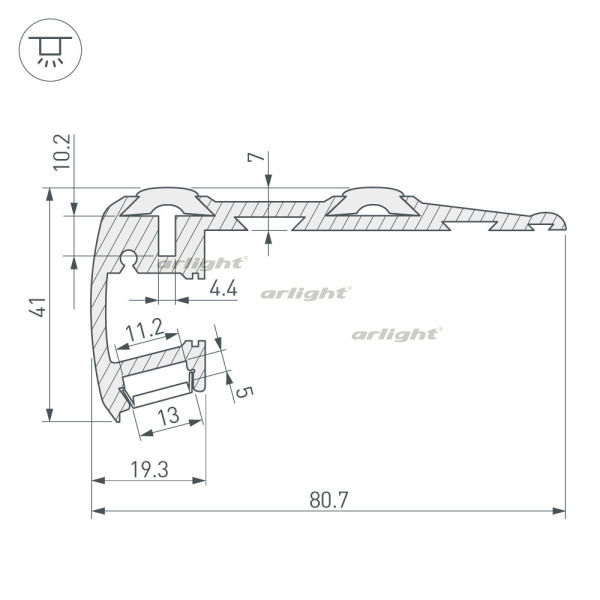 Накладной профиль черного цвета из высокопрочного анодированного алюминия для подсветки ступеней с антискользящими прокладками в комплекте. Габаритные размеры профиля составляют 2000 мм в длину, 81 мм в ширину и 41 мм в высоту. Площадки для установки светодиодных лент позволяют использовать ленты шириной до 10 мм (верхняя подсветка) 13 мм (нижняя подсветка) и мощностью до 27,7 Вт/м каждая. Это обеспечивает гибкость в выборе светодиодных лент и создает потрясающие световые решения.