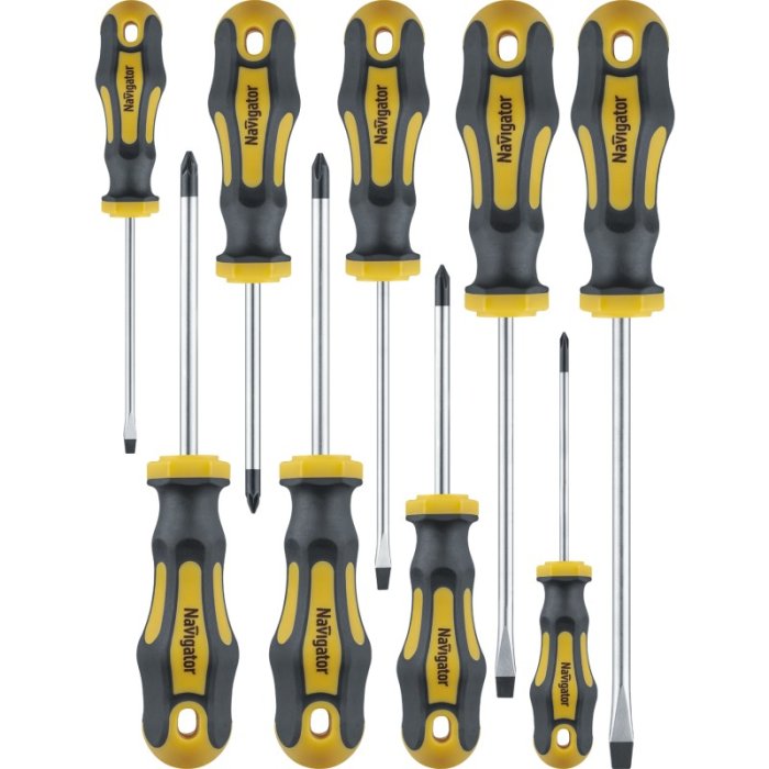 Набор из девяти отверток от производителя Navigator. Комплектность: SL2.5 х 75 мм, SL4 х 100 мм, SL5.5 х 125 мм, SL6.5 х 150 мм, PH0 х 60 мм, PH1 х 80 мм, PH2 х 100 мм,