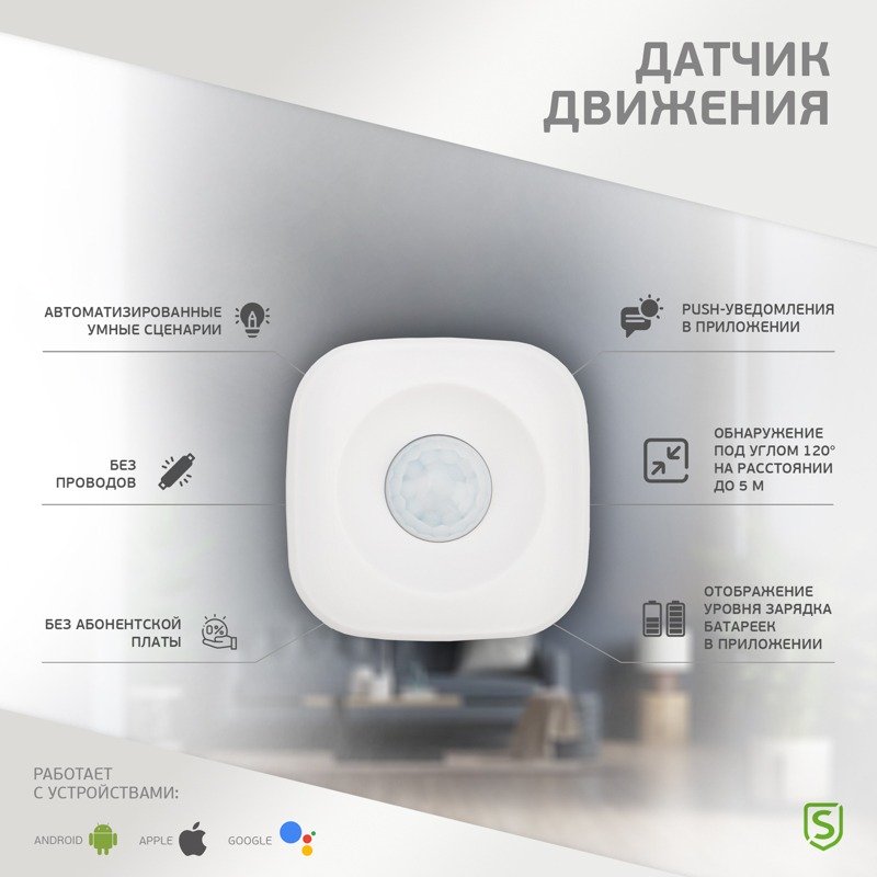 Беспроводной Wi-Fi датчик движения предназначен для распознавания несанкционированного проникновения в помещение. При обнаружении движения устройство отправляет пользователю PUSH-уведомление, что позволяет предотвратить вторжение и обеспечить безопасность. Помимо этого, при обнаружении движения устройство может запускать различные сценарии «умных домов», также включать/выключать свет и кондиционер, открывать/закрывать шторы и т.д.