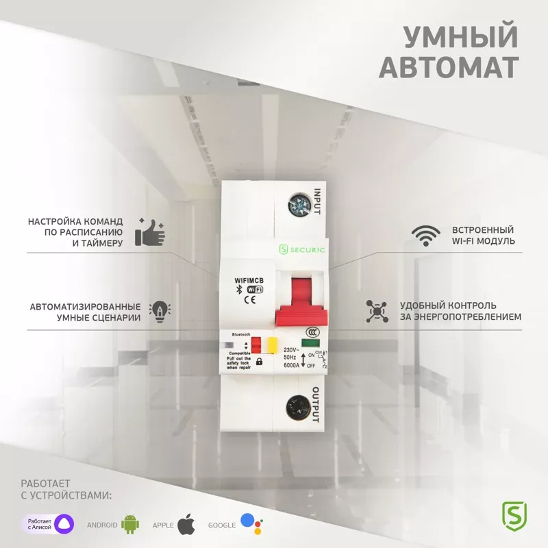Для работы автоматического выключателя необходимо наличие Wi-Fi сигнала. Устройство быстро и просто устанавливается на DIN-рейку.