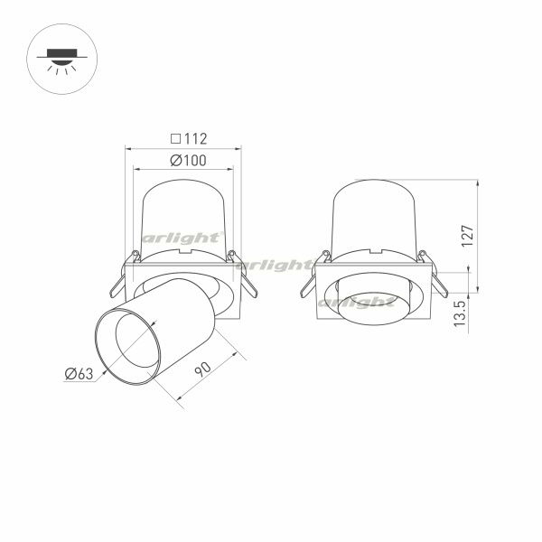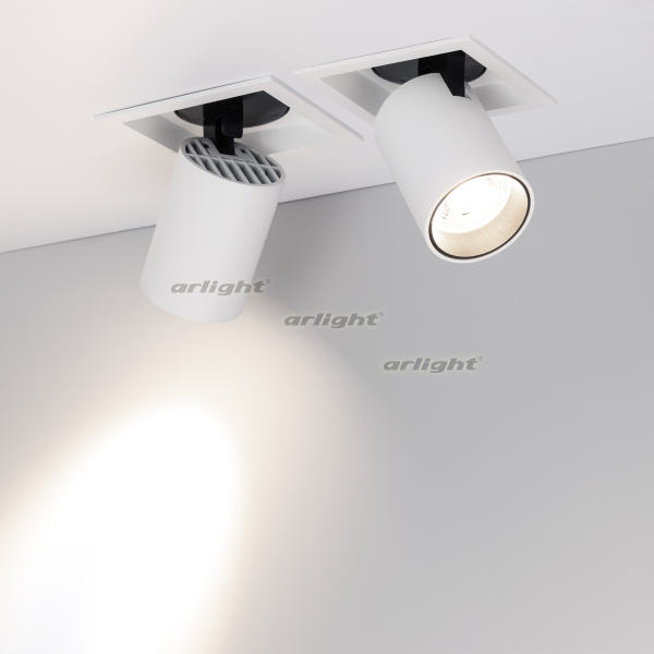 Встраиваемый поворотный выдвигающийся светильник для потолка. Мощность 10 Вт, св. поток 900 лм, 90 лм/Вт, дневной 4000 K, CRI>90, угол 24°, напряжение питания 230 В. Белый квадратный корпус из алюминия, экран PC, степень защиты IP20. Размер (Д×Ш×В) 112×112×127 мм. Монтаж встраиваемый, установочное отверстие Ø 100 мм. Драйвер 30-48 В, 250 мА, пульсация <1%.