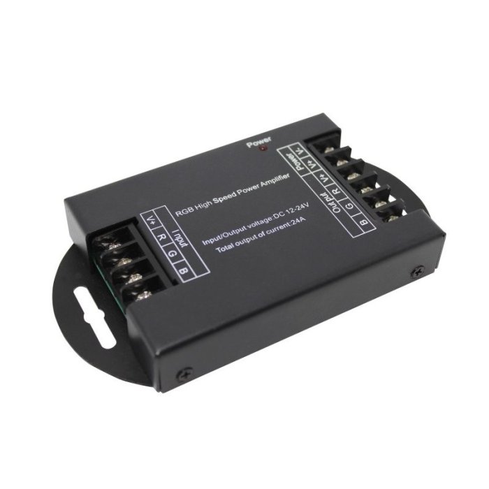 Высокоскоростной усилитель RGB для светодиодных лент. Возможно использовать как усилитель сигнала DMX, гальванически развязан. Напряжение питания 12-24V, 3 канала, выходной ток до 24A (до 8A на канал), мощность на 12В- 288Вт, 24В- 576Вт, размеры 145х76х21мм.