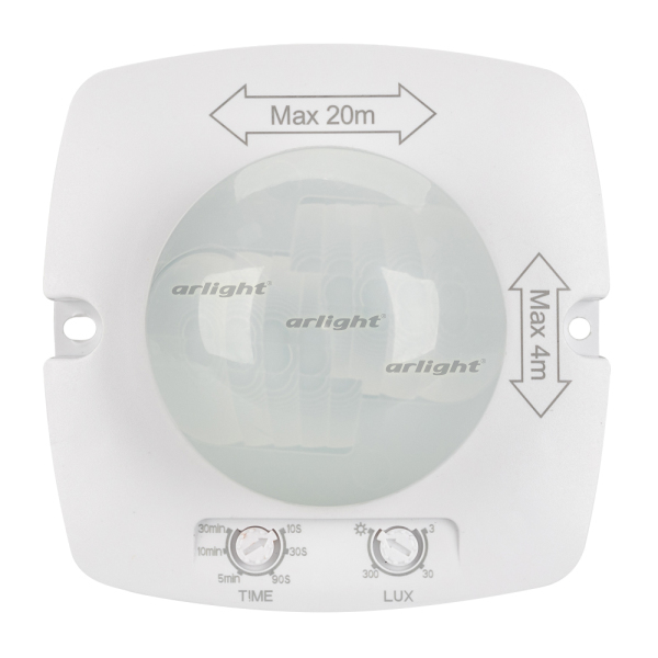 Настенный/потолочный накладной датчик движения (двухпроводная линия), совмещенный с датчиком освещенности. Угол обнаружения 360° в горизонтальной плоскости. Высота установки 4-10 м. Настройки: время отключения (10 c – 30 мин), зона срабатывания (до 20 м), освещенность (3 - 2000 люкс). Максимальная нагрузка 2000 Вт (для ламп накал-я и галогенных), 500 Вт (для светодиодных и люминесцентных ламп), размеры (L×W×H) 102x102x58 мм.