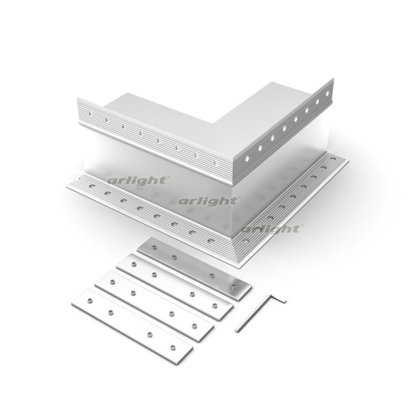 Угол в сборе, для профиля SL-LINIA55-FANTOM-EDGE. Свечение наружу. В комплекте угол с экраном, соединители, винты, шестигранный ключ.