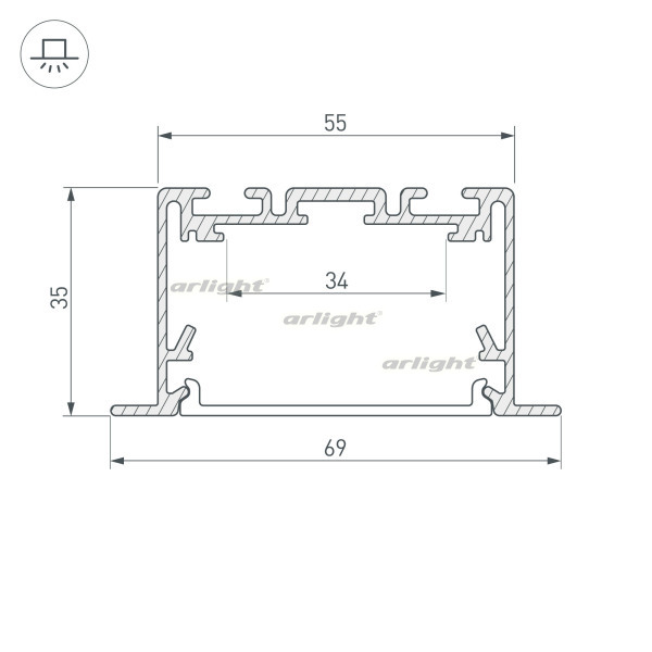 Габаритные размеры профиля составляют 2500 мм в длину, 69 мм в ширину и 35 мм в высоту. Площадка для установки светодиодных лент позволяет использовать ленту шириной до 34 мм и мощностью до 51 Вт/м. Это обеспечивает гибкость в выборе светодиодных лент и создает потрясающие световые решения.