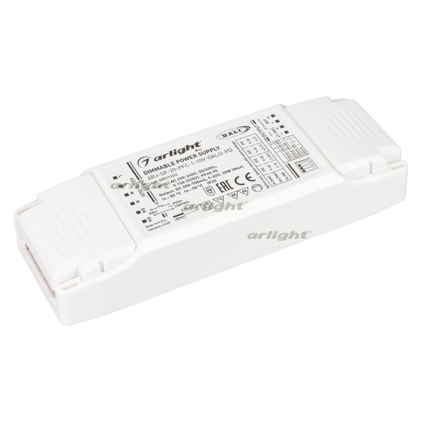 Диммируемый источник тока по протоколу DALI 2.0 (диапазон 2-100%), стандарту 1-10 В (диапазон 2-100%) с гальванической развязкой для светильников и мощных светодиодов. Входное напряжение 220-240 VAC. Выходные параметры: 9-60 В, 250-700 mА, 20 Вт. Встроенный PFC >0,9. Негерметичный пластиковый корпус IP 20. Габаритные размеры длина 150 мм, ширина 52 мм, высота 28 мм. Гарантийный срок 5 лет.