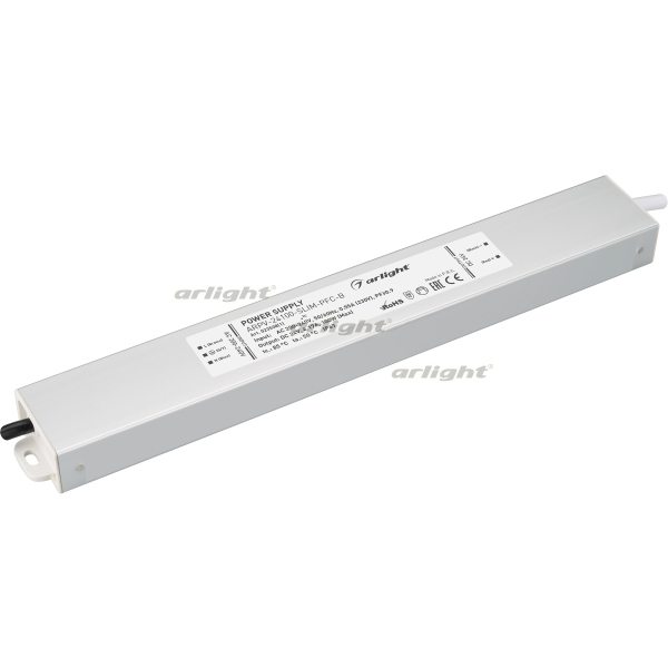 Источник напряжения с гальванической развязкой для светодиодных изделий. Входное напряжение 200-240 VAC. Выходные параметры: 24 В, 4.2 А, 100 Вт. Встроенный PFC >0.9. Герметичный алюминиевый корпус IP 67. Рабочая температура -40…+50C⁰. Габаритные размеры длина 298 мм, ширина 40 мм, высота 22 мм. Гарантийный срок 3 года.