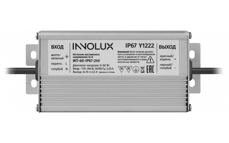 Компактный металлический анодированный корпус в исполнении графит. Заполнен теплопроводящим компаундом. Многожильный проводник для подключения питающей сети и нагрузки.