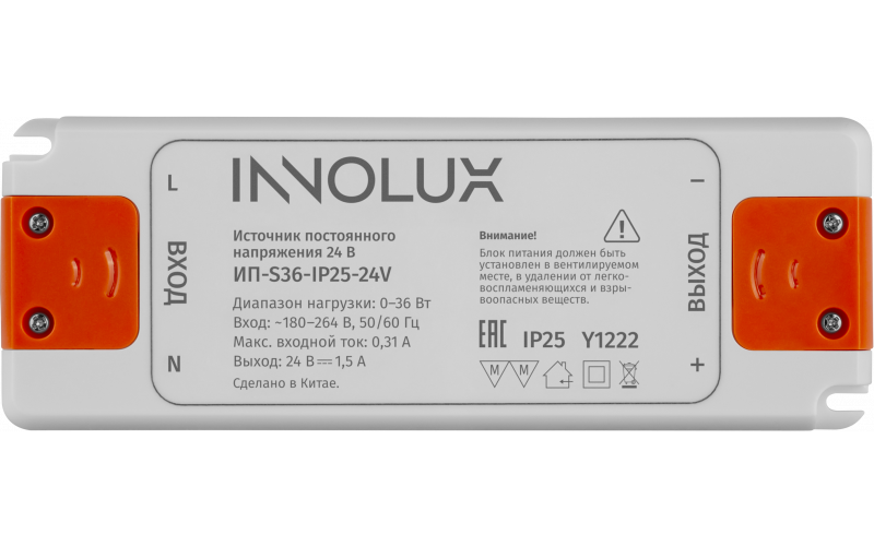 Блок питания в компактном пластиковом корпусе. Размеры: 98мм*46мм*15мм. Мощность 36 Вт. Выходное напряжение 24 В.