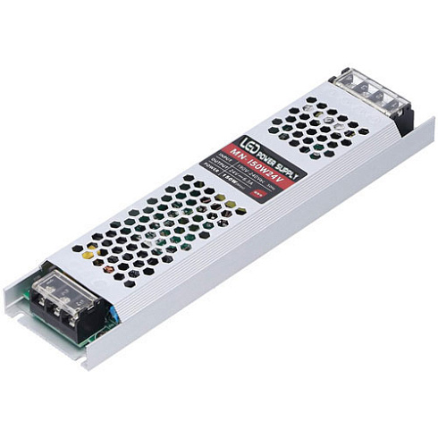 Источник стабилизированного напряжения 24V 150W 6,25A в защитном кожухе. Степень защиты IP20. Входное напряжение 190-240V, выходное напряжение 24V. Размеры 220x53x22мм. Тонкий алюминиевый корпус. Клеммная винтовая колодка для подключения питающей сети и нагрузки.