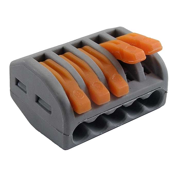 Клемма зажимная соединительная безвинтовая RUICHI 222-415, 5-ти контактная, 24 А, аналог WAGO – это навесная клеммная колодка, используемая при электромонтажных работах для соединения проводов.