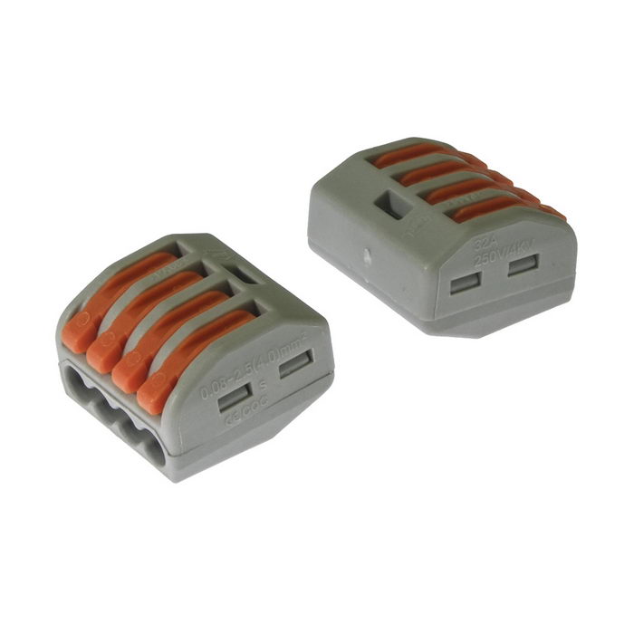 Клемма зажимная соединительная безвинтовая RUICHI PCT-214, 4-х контактная, 24 А, аналог WAGO – это навесная клеммная колодка, используемая при электромонтажных работах для соединения проводов.