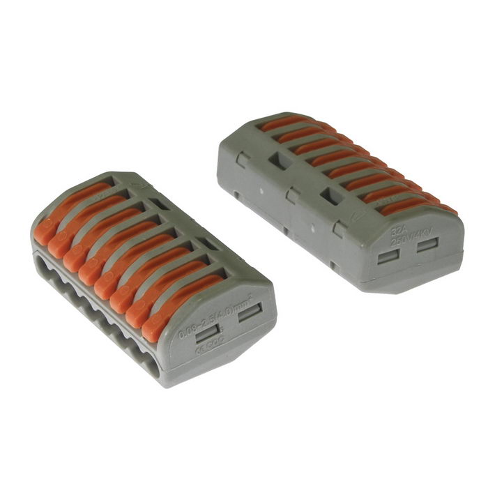 Клемма зажимная соединительная безвинтовая RUICHI PCT-218, 8-ми контактная, 24 А, аналог WAGO – это навесная клеммная колодка, используемая при электромонтажных работах для соединения проводов.