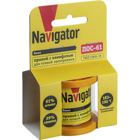Припои с канифолью ПОС-61 Navigator предназначены для пайки и лужения радио- и электро-аппаратуры, печатных схем, где недопустим перегрев. Содержание канифоли в припое делает паянное соединение герметичным и механически прочным. Единственный припой на рынке, подлинность химического состава которого подтверждена ФБУ «РОСТЕСТ-МОСКВА».