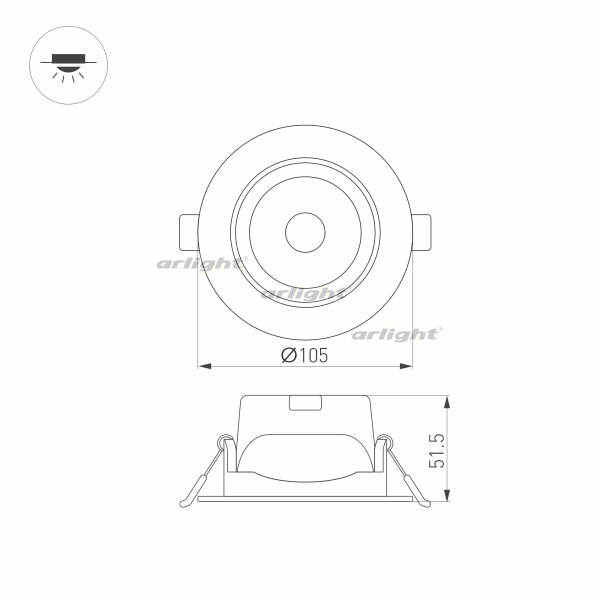 Встраиваемый поворотный светильник "даунлайт". Мощность 10 Вт, св. поток 900 лм, 90 лм/Вт, дневной 4000 K, CRI>80, UGR<19, угол 36°, напряжение питания 230 В. Белый круглый корпус из теплопроводящего полиамида, степень защиты IP20, угол поворота оси 30°. Размер: диаметр 105 мм, высота 51.5 мм. Монтаж встраиваемый, установочное отверстие диаметр 83-95 мм. Пульсация <2%.