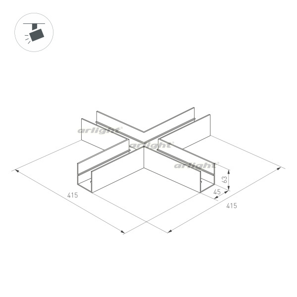 Крестовой прямой коннектор для трека MAG-TRACK-4563. Материал алюминий, цвет черный. Размеры 415x415x45x63мм. DC24V.