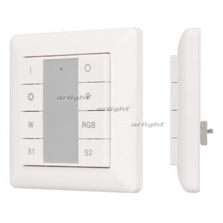Встраиваемая пластиковая панель белого цвета с кнопочным управлением, предназначенная для управления мультицветными RGBW светодиодными лентами, светильниками и другими источниками света в системах управления светом DALI DT8. Позволяет включать/выключать свет, менять его яркость и управлять цветом в 1 группе либо в режиме широковещателя (Broadcast). Сохранение и вызов 2 сцен. Установка номера группы и сцен выполняется переключателями на задней стороне панели. Устройство совместимо с диммерами стандарта DALI. Передача команд от панели к диммерам выполняется по общей двухпроводной шине DALI. Удобное и точное управление при помощи отдельных механических кнопок для каждой функции. Питание от шины DALI. Габариты устройства составляют 81х81х22.5 мм. Панель совместима с декоративными рамками ведущих мировых производителей (GIRA, JUNG, BERKER, MERTEN).