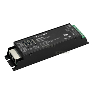 Декодер (преобразователь) цифрового сигнала DMX512 в ШИМ для управления светодиодными лентами. Декодер может регулировать яркость мультицветных лент, осуществлять включение и выключение света, управлять цветом. Декодер совместим с панелями управления с выходом DMX512 и контроллерами DMX512. Также, управление декодером осуществляется кнопками на корпусе, а информация о режиме отображается на цифровом дисплее. Устройство оснащено разъемами RJ-45, обеспечивающими трансляцию сигнала DMX512 на вход и выход. Питание декодера имеет диапазон напряжений от 12В до 36В, максимальный ток 8А на 1 канал, максимальная мощность 384-1150Вт (в зависимости от напряжения питания), 4 канала управления. Габариты декодера составляют 175х46х32мм, металлический корпус черного цвета.