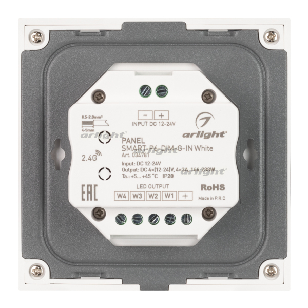 Встраиваемая сенсорная стеклянная панель 2.4 ГГц, цвет белый. Для управления одноцветными источниками света (ШИМ). Управление яркостью с помощью сенсорной полосы. Работает в режиме master/slave и может выполнять функцию независимого контроллера. Питание/рабочее напряжение 12-24VDC, 4 параллельных канала по 3А максимальной нагрузки на канал, максимальная суммарная мощность 144-288W. Габариты 86х86х33 мм. Панель совместима с диммерами серии SMART. Возможно управление пультами (см. совместимые товары) или другими панелями.