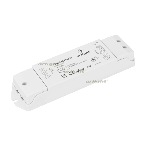 2-канальный усилитель, предназначенный для увеличения мощности и подключения большего количества мультибелых (MIX) светодиодных лент. Питание изделия имеет диапазон напряжений от 12В до 36В, максимальный ток 8А на 1 канал, максимальная мощность 192-576Вт (в зависимости от напряжения питания). Усилитель имеет пластиковый корпус белого цвета. Габариты изделия составляют 175x45x27 мм.