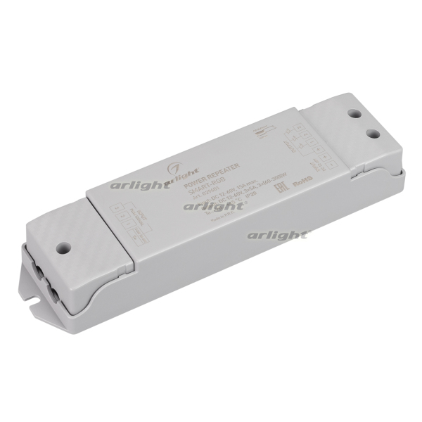 3-канальный усилитель, предназначенный для увеличения мощности и подключения большего количества мультицветных (RGB) светодиодных лент. Питание изделия имеет диапазон напряжений от 12В до 60В, максимальный ток 5А на 1 канал, максимальная мощность 216-1080Вт (в зависимости от напряжения питания). Усилитель имеет пластиковый корпус серого цвета. Габариты изделия составляют 175x45x27 мм.