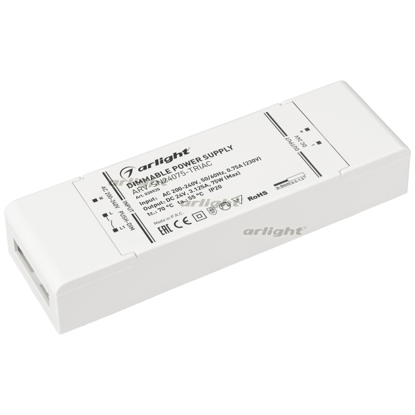 Блок питания 24V с гальванической развязкой, ток 3,125А, 75 Вт, с управлением от симисторного настенного диммера (TRIAC) и/или с помощью функции Push-dim, без корректора мощности, PF>0,5. Рекомендуется для использования с настенными диммерами типа RL (резистивная нагрузка, Leading edge). Пластиковый корпус IP20. Вход: 200-240VAC. Выход: 24VDC 3.125A. Размер 179х56х30 mm. Гарантия 3 года.