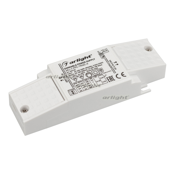 Диммируемый источник тока по стандарту TRIAC с гальванической развязкой для светильников и мощных светодиодов. Входное напряжение 220-240 VAC. Выходные параметры: 12-20 В, 180-350 mА, 7 Вт. Выбор значения тока осуществляется DIP-переключателем. Встроенный PFC >0,92. Негерметичный пластиковый корпус IP 20. Габаритные размеры длина 122 мм, ширина 41 мм, высота 23 мм. Гарантийный срок 5 лет.