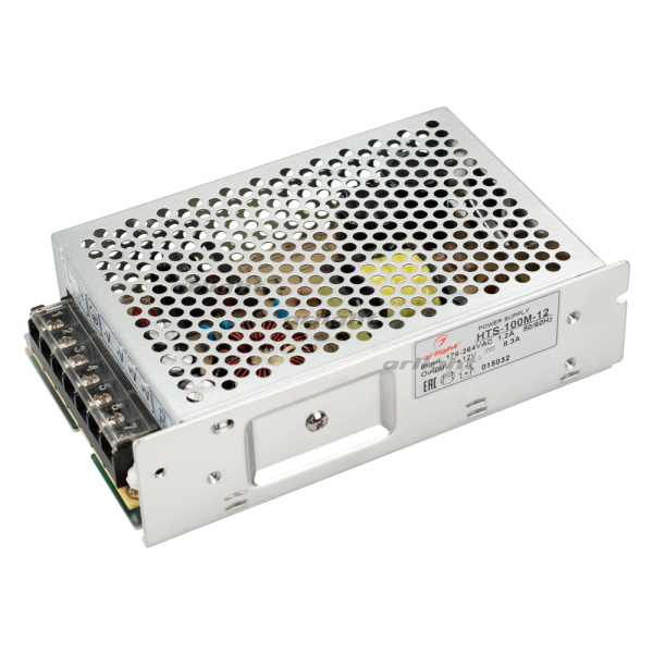 Источник напряжения с гальванической развязкой для светодиодных изделий. Входное напряжение 176-264 VAC. Выходные параметры: 12 В, 8,3 А, 100 Вт. Встроенный PFC >0,5. Негерметичный алюминиевый сетчатый корпус IP 20. Габаритные размеры длина 159 мм, ширина 98 мм, высота 42 мм. Гарантийный срок 3 года.