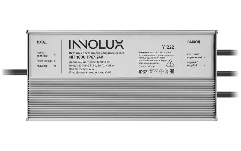 Компактный металлический анодированный корпус в исполнении графит. Заполнен теплопроводящим компаундом. Многожильный проводник для подключения питающей сети и нагрузки.