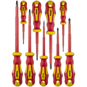 Набор из девяти диэлектрических отверток от производителя Navigator. Комплектность: SL2.5 х 75 мм, SL4 х 100 мм, SL5.5 х 125 мм, SL6.5 х 150 мм,